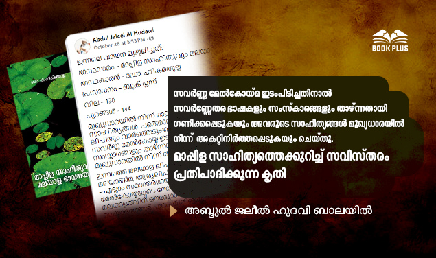 മുഖ്യധാരയിൽ നിന്ന് മാറ്റിനിർത്തി ഉപസംസ്കാരമായി കാണേണ്ടതല്ല മാപ്പിള സാഹിത്യങ്ങൾ. പത്തൊമ്പതാം നൂറ്റാണ്ടിൽ മലയാള ഭാഷക്ക് തനത് രൂപവും ലിപിയും വാർത്തെടുക്കുന്നതിലും അങ്ങനെ മാനക മലയാളം സ്ഥാപിച്ചതിലും സവർണ്ണ മേൽകോയ്മ ഇടംപിടിച്ചതിനാൽ സവർണ്ണേതര ഭാഷകളും സംസ്കാരങ്ങളും താഴ്ന്നതായി ഗണിക്കപ്പെടുകയും അവരുടെ സാഹിത്യങ്ങൾ മുഖ്യധാരയിൽ നിന്ന് അകറ്റിനിർത്തപ്പെടുകയും ചെയ്തു.