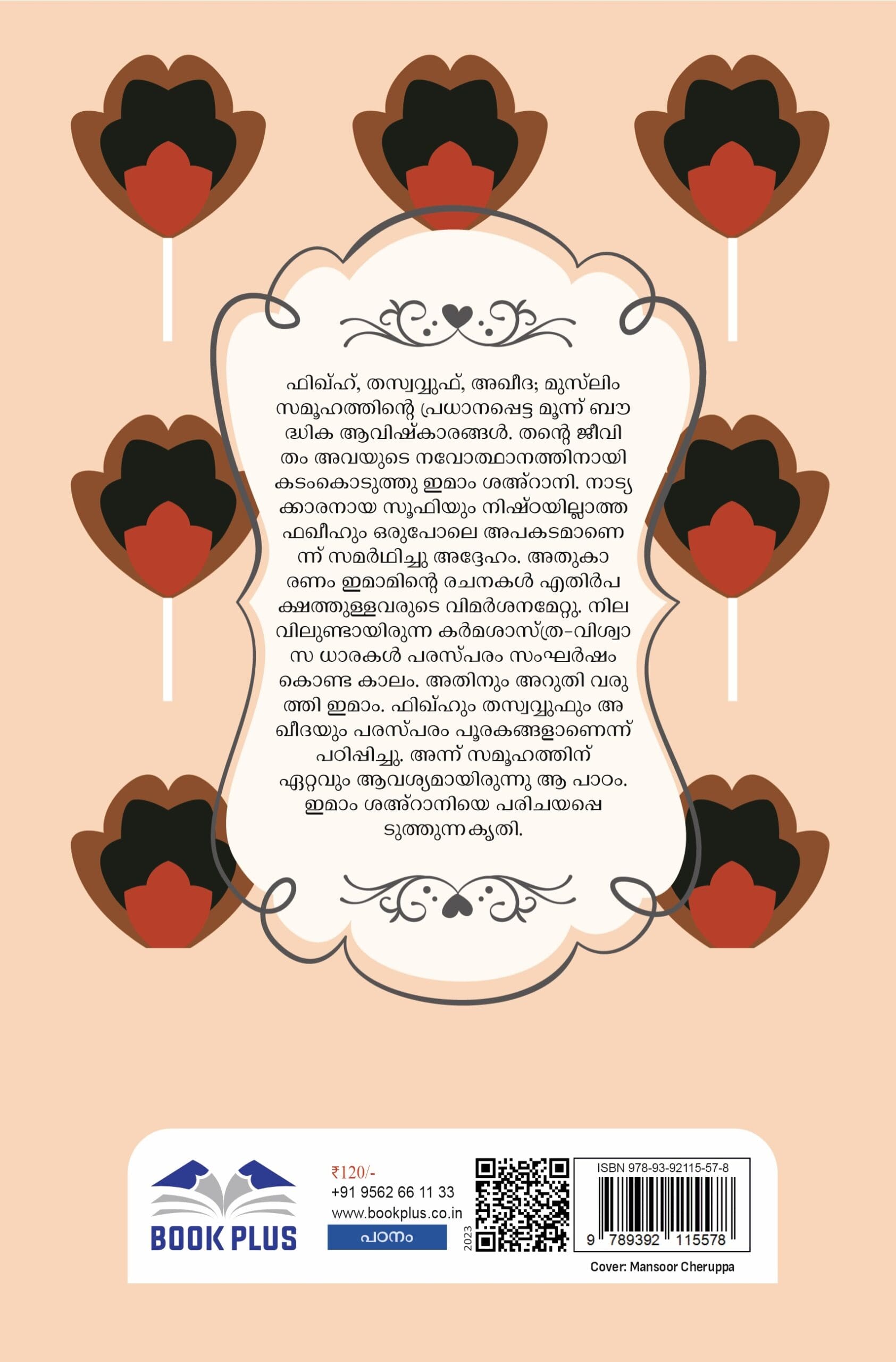 ഫിഖ്ഹ്, തസ്വവുഫ്, അഖീദ, മുസ്ലിം സമൂഹത്തിന്റെ പ്രധാനപ്പെട്ട മൂന്ന് ബൗദ്ധിക ആവിഷ്കാരങ്ങൾ. തന്റെ ജീവിതം അവയുടെ നവോത്ഥാനത്തിനായി കടംകൊടുത്തു ഇമാം ശഅ്റാനി. നാട്യക്കാരനായ സൂഫിയും നിഷ്ഠയില്ലാത്ത ഫഖീഹും ഒരുപോലെ അപകടമാണെന്ന് സമർഥിച്ചു അദ്ദേഹം. അതുകാ രണം ഇമാമിന്റെ രചനകൾ എതിർപക്ഷത്തുള്ളവരുടെ വിമർശനമേറ്റു. നില വിലുണ്ടായിരുന്ന കർമശാസ്ത്ര-വിശ്വാ സ ധാരകൾ പരസ്പരം സംഘർഷം കൊണ്ട കാലം. അതിനും അറുതി വരു ത്തി ഇമാം. ഫിഖ്ഹും തസ്വവുഫും അ ഖീദയും പരസ്പരം പൂരകങ്ങളാണെന്ന് പഠിപ്പിച്ചു. അന്ന് സമൂഹത്തിന് ഏറ്റവും ആവശ്യമായിരുന്നു ആ പാഠം. ഇമാം ശഅ്റാനിയെ പരിചയപ്പെ ടുത്തുന്ന കൃതി.